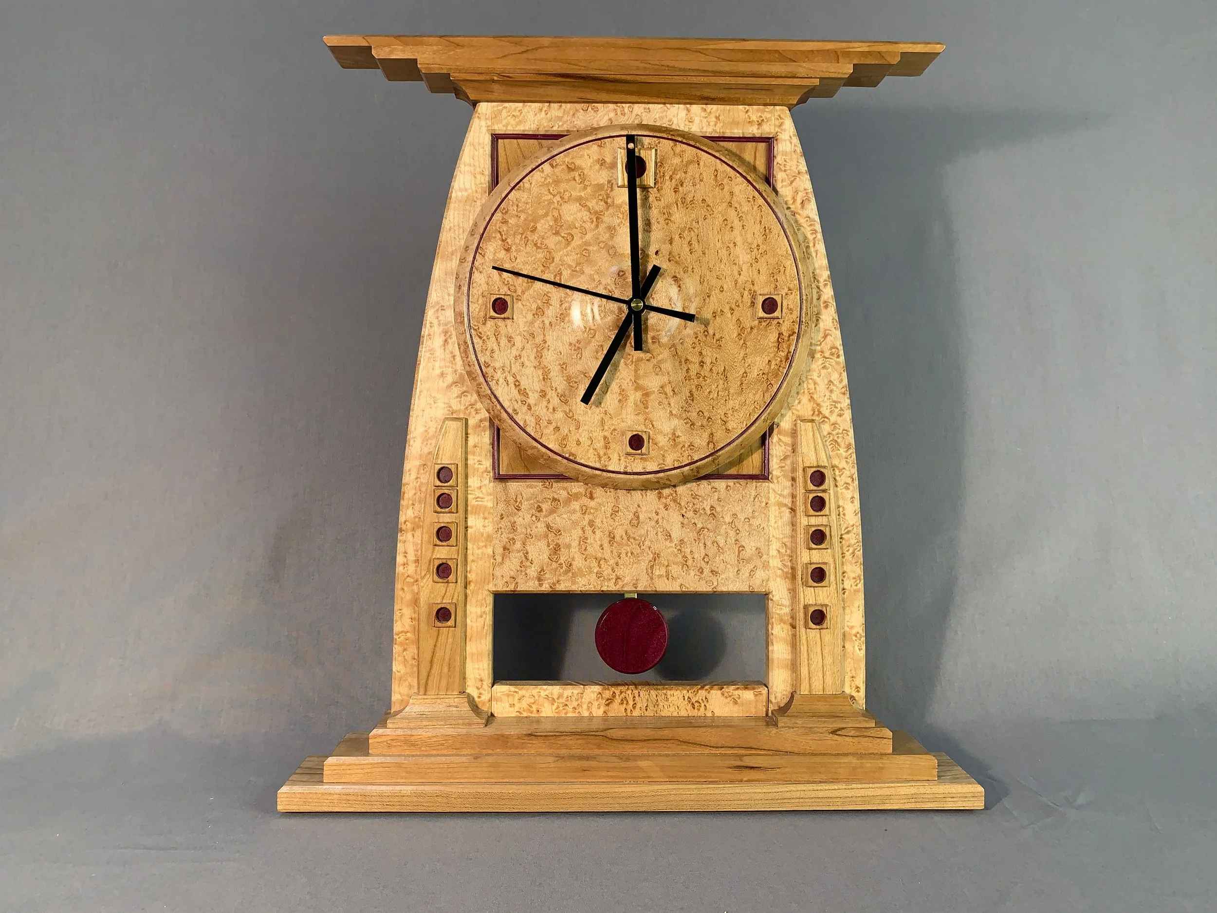 Seven O’clock View fullsize Seven O’clock 2021Mantle Clock with pendulum 17 X 19Birdseye Maple, Cherry, Purpleheart, Quartz Movement